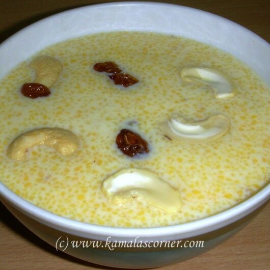 This Payasam is a delicious dessert made with cornmeal, milk and Badam mix powder. It is garnished with cashew nuts and raisins, and can be enjoyed hot or cold.